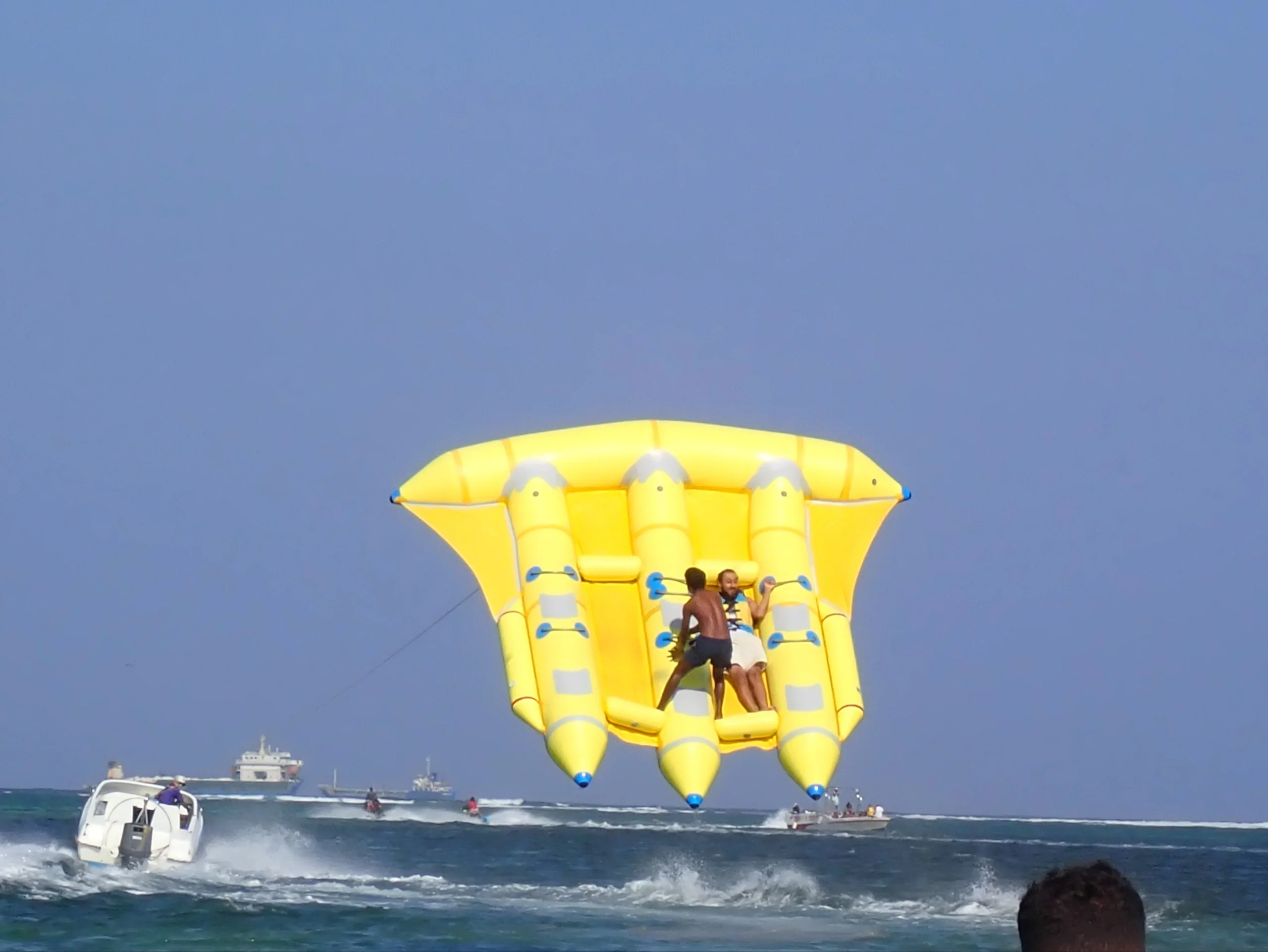 Begitu speedboat mulai melaju, perahu karet Fly Fish akan tertarik dan perlahan naik ke udara.